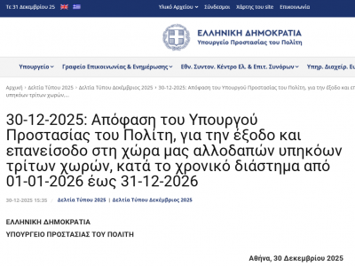 2025年12月30日:公民保护部长关于2026年1月1日至2026年12月31日期间外国第三国国民出入境的决定希腊共和国